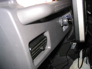 助手席用液晶モニタはダッシュボード中央(左写真)に移動したが、夜の運転でまぶしかったので助手席に移動。グローブボックスのふたへの取り付けでは邪魔になるので移動(右写真)したが、グローブボックスのふたに穴が残ってしまった。