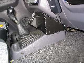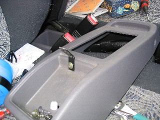 センタースピーカーを取り付ける。付属のアンプは運転席シート下に設置。
