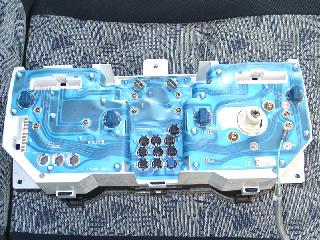 まずメーターパネルを取り外す。次にメーター本体を外したが、スピードメーターケーブルがつながっていて引っ張り出すことが出来ない状態になっていた。なんとか外せないかと裏側から手を回しシャフト部を手でつまんだら簡単に外れた。後はカプラー3箇所を抜いてからメーター部を引き抜いた。このときハンドルが邪魔になるのでメーターの下部を手前に向けて引き抜いた。