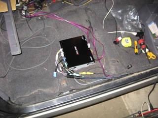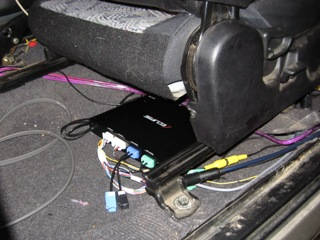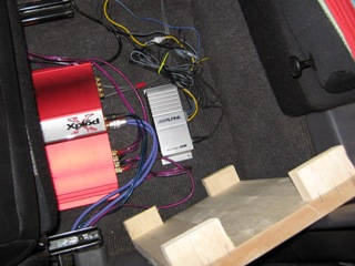 運転席シートの下に設置していたセンタースピーカーのアンプを、後部座席足元に移動