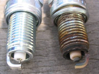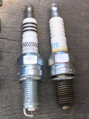 | 新旧プラグを比較。ピンボケでわかりにくいですが、電極が摩耗して角が取れています。 | ||
