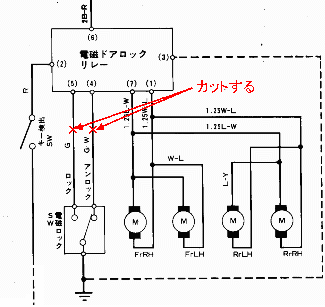 キーレスエントリシステムの説明書通り「ロック」と「アンロック」の線を単純に分岐させただけではキーレスエントリは動作しない。ドアロックがアンロック状態の時はキーレスエントリシステムからロック信号が流れてきてもロックとアンロックの両方に信号が流れてしまうからである。逆の場合も同様である。(そのため非対応車種になっているようです)
