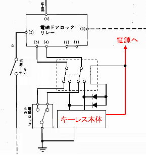 そこで中央の図の様な回路を考えてみた。キーレスエントリが動作していない時は従来どおり電磁ロックスイッチにつながっているが、キーレスエントリに信号が流れた瞬間だけリレーが動作し電磁ロックスイッチからキーレスエントリシステムに配線が切り替わる。
